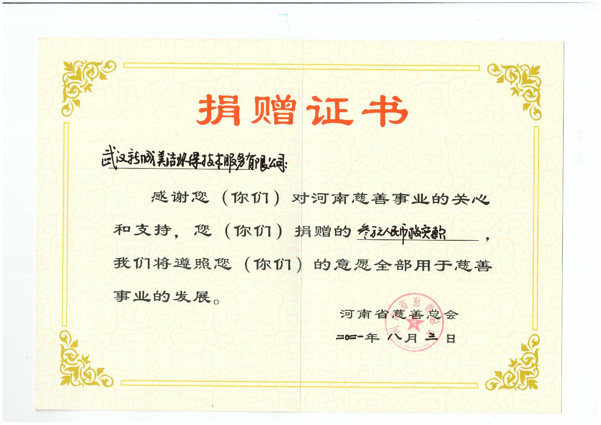 2021年河南慈善事業(yè)捐贈證書